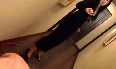 Asian mature doll in tights humiliates crossdresser lying on the floor